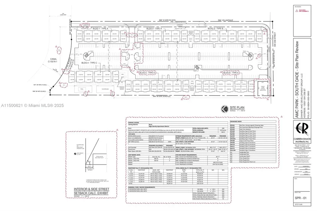 CDMP /Zoning application ALREADY APPROVED FOR HIGH DENSITY APARTMENT HOUSING DISTRICT; RU-4 MAXIMUM DENSITY PERMITTED (50 DU/ACRE). Site plan consists of six (6) multi-family apt blds, 84 UNITS (1BD)/164 UNITS (2BD), that are 3-story height, 248 workforce housing dwelling units arrayed around the periphery of the property, 370 surface parking spaces in the center, amenities such as a swimming pool, playground, pedestrian walking paths, mail kiosks, bicycle racks and landscaped common open areas. The site plan also depicts the dedication of SW 125 Ave and SW 236 Street which provide public access to the site. The development will have two ingress-egress vehicular and pedestrian access along SW 125 Avenue and SW 236 Street.